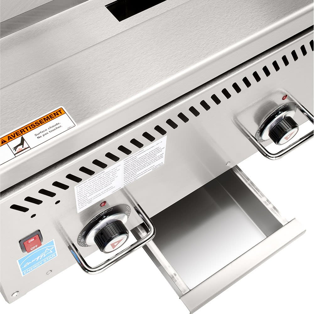 Adjustable legs lift the Vulcan VCGG24-AC gas griddle to accommodate changing kitchen needs for added versatility. Overall, it has a 14.7-inch-tall cooking height. Tapered side splash guards and a rear backsplash work together to contain hot grease so it doesn’t spill onto the counter or the operator. A 6-quart grease drawer collects the leftover and used grease, and it’s removable for simplified cleaning and replacement.