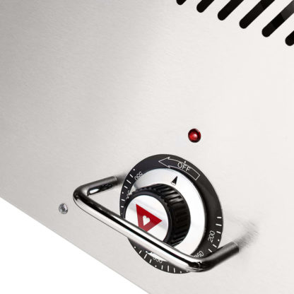 - Solid-state thermostat heats 12-in.-wide griddle sections
