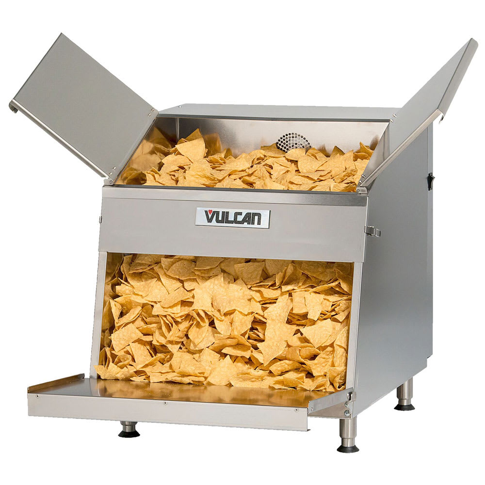 The Vulcan VCW26 chip warmer has a top load design, creating a first in, first out system to help keep chips fresh. Loading the unit is simple since the doors at the top have a wide opening. When opened, the bottom door creates a shelf to make it easy to scoop chips out. The thermostat is adjustable from 90 to 190 degrees Fahrenheit and is located on the rear of the warmer. The fan circulates air for quick and even heating, while high-density insulation retains the heat. Chip breakage is reduced with an interior baffle. Since the Vulcan VCW26 chip warmer is made of stainless steel, it is corrosion resistant and durable to withstand commercial use.