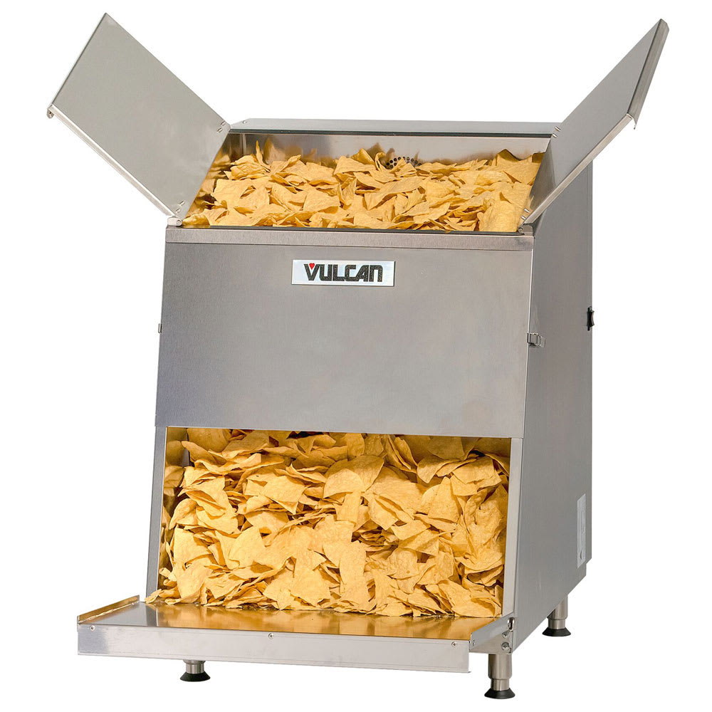 The Vulcan-Hart VCW46 top load chip warmer holds 46 gallons of chips that are dumped in through wide top-opening doors. The front of the warmer is slightly slanted so the bottom door closes and opens easily, creating a shelf for chips to be scooped up on. An internal baffle helps prevent chip breakage, and a fan circulates air in the warmer to keep chips heated evenly. The front panel, baffle on the bottom, and the bottom door are removable without tools so they can be easily cleaned. This warmer comes with legs that are adjustable between 4 to 5 inches so it stays level on uneven surfaces. The thermostat is mounted on the back of the warmer and is adjustable from 90 to 190 degrees Fahrenheit. The stainless steel construction of the Vulcan-Hart VCW46 top load chip warmer makes it durable, and its insulation keeps heat from escaping.