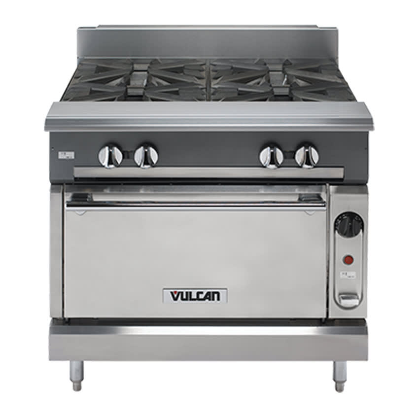 V Series Heavy Duty Range, 36″, work top, cabinet base, stainless steel front, top front ledge, sides, base, burner box & stub back, 6″ adjustable legs