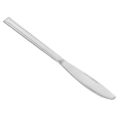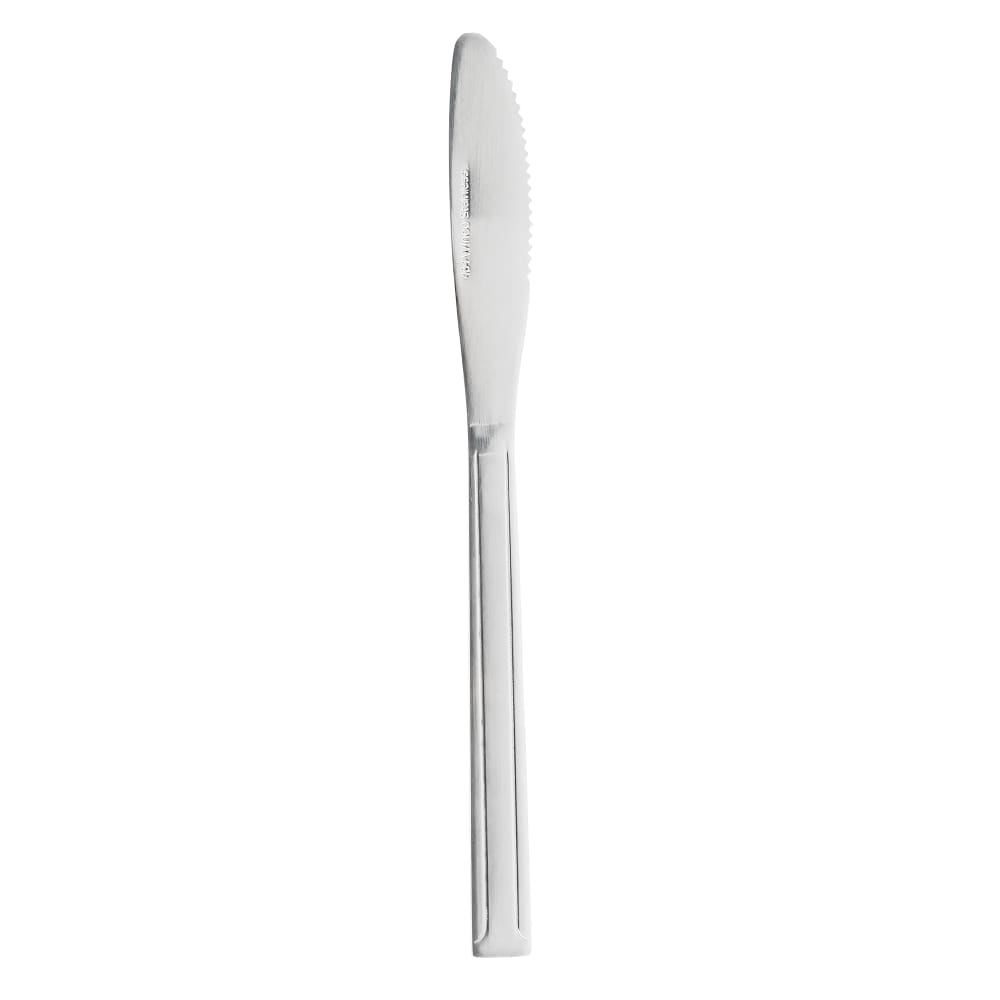 Great for cutting soft meats, vegetables, and other rough food, the Winco 0001-08 dinner knife has a rounded tip and is slightly longer than a butter knife. Because the utensil is part of the Dominion pattern, its handle has two lines that provide an art deco look. Its 18/0 stainless steel construction is economical since it contains no nickel.