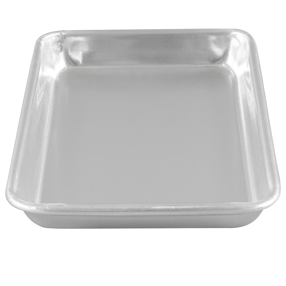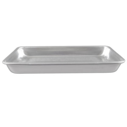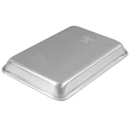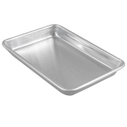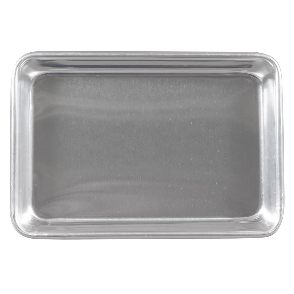 Featuring an open bead and 12-gauge thickness, the Winco ALXP-0609 eighth-size sheet pan is very durable. It measures 91/2 inches long by 61/2 inches wide and can support heavy items in the oven for slow roasting or high-temperature baking. To supply durability and warp resistance, the 3003 aluminum construction contains magnesium and other metals.