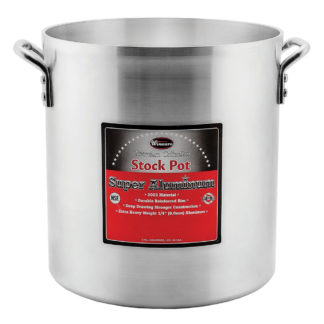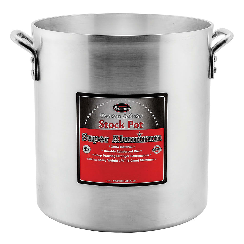 The Winco AXHH-80 aluminum stock pot has an 80-quart capacity and can be used to slowly simmer a variety of food-from soups and stews to seafood and vegetables. It has tall sides that slow down liquid evaporation and encourage the liquid to bubble for maximize flavor extraction. Made of extra-thick, reinforced aluminum, this pot efficiently and uniformly distributes heat and supports high-volume use. Designed to support heavy loads, the side handles are thick.