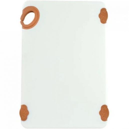 The Winco Statik Board has a patented design focused on safety. Molded-through, non-slip rubberized feet prevent slipping and sliding, even on wet countertops. The board is firm and sturdy, constructed with a durable, co-polymer that prevents the cutting board from warping over time. The surface of the cutting board is tough enough to reduce knife dulling. When storing the board, its rubberized sides keep the board upright and prevent sliding. A built-in hook allows for hygienic hanging storage and also serves as a convenient handle for easy transport of the cutting board.