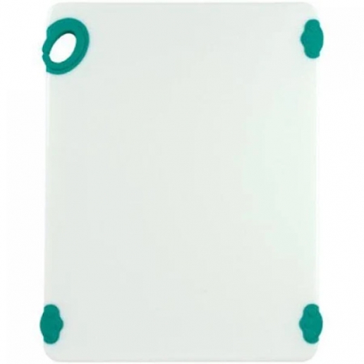 The Winco Statik Board has a patented design focused on safety. Molded-through, non-slip rubberized feet prevent slipping and sliding, even on wet countertops. The board is firm and sturdy, constructed with a durable, co-polymer that prevents the cutting board from warping over time. The surface of the cutting board is tough enough to reduce knife dulling. When storing the board, its rubberized sides keep the board upright and prevent sliding. A built-in hook allows for hygienic hanging storage and also serves as a convenient handle for easy transport of the cutting board.