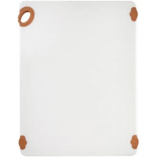 The Winco Statik Board has a patented design focused on safety. Molded-through, non-slip rubberized feet prevent slipping and sliding, even on wet countertops. The board is firm and sturdy, constructed with a durable, co-polymer that prevents the cutting board from warping over time. The surface of the cutting board is tough enough to reduce knife dulling. When storing the board, its rubberized sides keep the board upright and prevent sliding. A built-in hook allows for hygienic hanging storage and also serves as a convenient handle for easy transport of the cutting board.