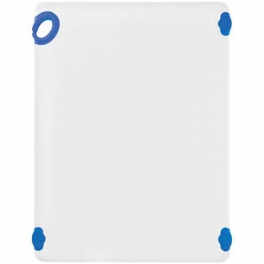 The Winco Statik Board has a patented design focused on safety. Molded-through, non-slip rubberized feet prevent slipping and sliding, even on wet countertops. The board is firm and sturdy, constructed with a durable, co-polymer that prevents the cutting board from warping over time. The surface of the cutting board is tough enough to reduce knife dulling. When storing the board, its rubberized sides keep the board upright and prevent sliding. A built-in hook allows for hygienic hanging storage and also serves as a convenient handle for easy transport of the cutting board.