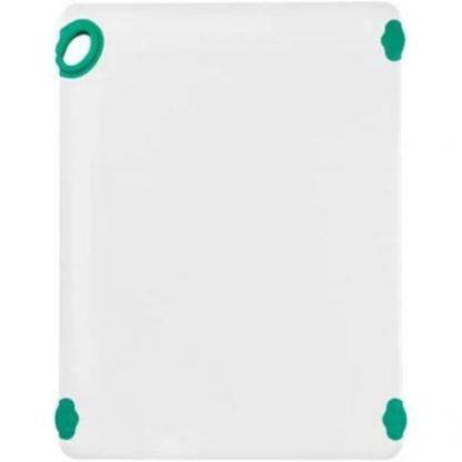 The Winco Statik Board has a patented design focused on safety. Molded-through, non-slip rubberized feet prevent slipping and sliding, even on wet countertops. The board is firm and sturdy, constructed with a durable, co-polymer that prevents the cutting board from warping over time. The surface of the cutting board is tough enough to reduce knife dulling. When storing the board, its rubberized sides keep the board upright and prevent sliding. A built-in hook allows for hygienic hanging storage and also serves as a convenient handle for easy transport of the cutting board.