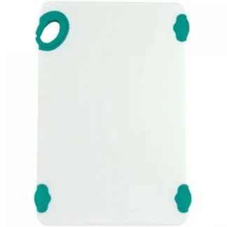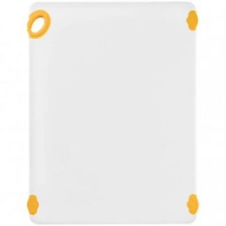 The Winco Statik Board has a patented design focused on safety. Molded-through, non-slip rubberized feet prevent slipping and sliding, even on wet countertops. The board is firm and sturdy, constructed with a durable, co-polymer that prevents the cutting board from warping over time. The surface of the cutting board is tough enough to reduce knife dulling. When storing the board, its rubberized sides keep the board upright and prevent sliding. A built-in hook allows for hygienic hanging storage and also serves as a convenient handle for easy transport of the cutting board.