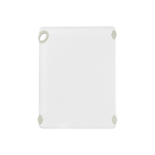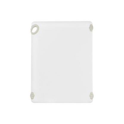 The Winco Statik Board has a patented design focused on safety. Molded-through, non-slip rubberized feet prevent slipping and sliding, even on wet countertops. The board is firm and sturdy, constructed with a durable, co-polymer that prevents the cutting board from warping over time. The surface of the cutting board is tough enough to reduce knife dulling. When storing the board, its rubberized sides keep the board upright and prevent sliding. A built-in hook allows for hygienic hanging storage and also serves as a convenient handle for easy transport of the cutting board.
