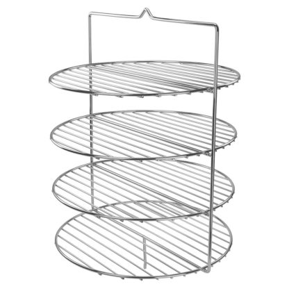 The Winco EDM-P58 pizza rack is made to rotate within the Winco EDM-2 pizza merchandiser. It measures 18 inches high with four tiers featuring a 15-inch diameter. The rack is made with a durable chrome-plated finish to attractively merchandise pizzas in the case.