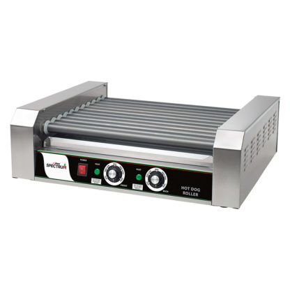 Spectrum RollsRight Hot Dog Grill, roller type, capacity: 30 hot dogs, multiple power levels, (2) independent thermostatic heat controls (front & rear), teflon non-stick coated rollers with sealed ends, heavy duty sealed motor, bike chain & sprocket drive assembly, heating elements in each roller, re-settable fuse, stainless steel full size drip tray & body, non-skid rubber feet, 110v/60/1-ph, 1400 watts, 12.7 amps, NEMA 5-15P, cETLus, ETL