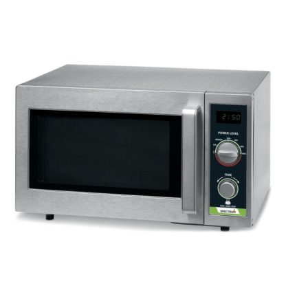 Spectrum Commercial Microwave, .9 cubic feet capacity, 1450 W input power, dial control, accommodates 12″ dia. platter, bottom energy feed system with ceramic plate, backlit LED display, interior oven light, customizable cooking timer up 60 minutes, stainless steel, 120v/60/1-ph, 12 amp, 1000 watts, cULus