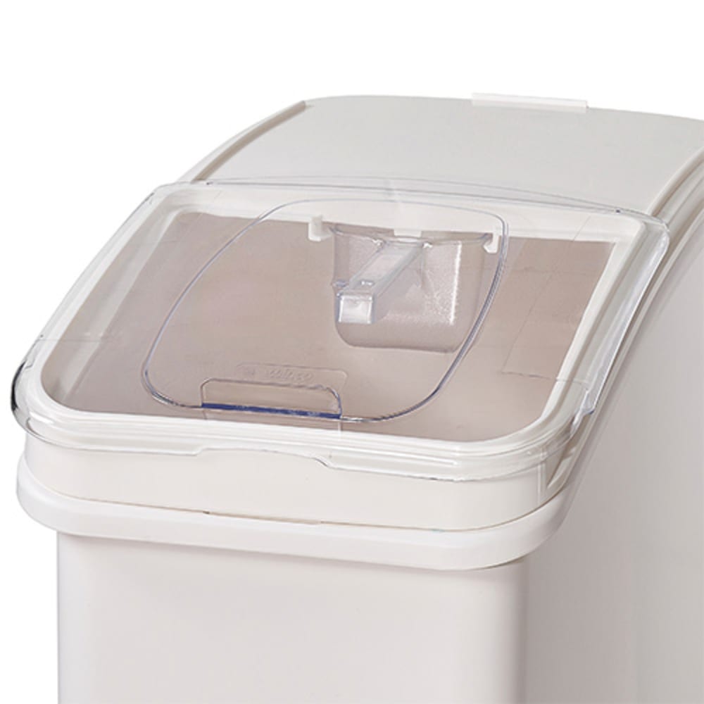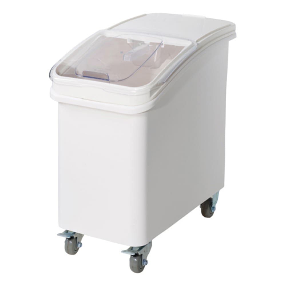 Ingredient Bin, 27 gallon, 15-1/2″ x 29-1/2″ x 28″, transparent polycarbonate lid, clasp sliding lid, scoop, 3″ caster wheels (2 with brakes), polypropylene body, white, NSF