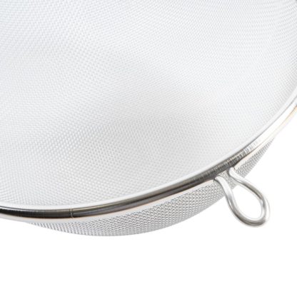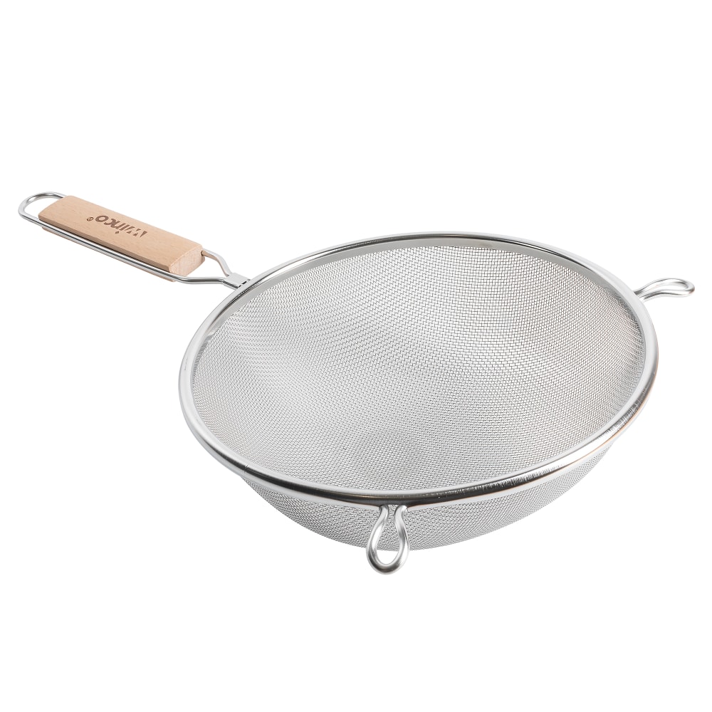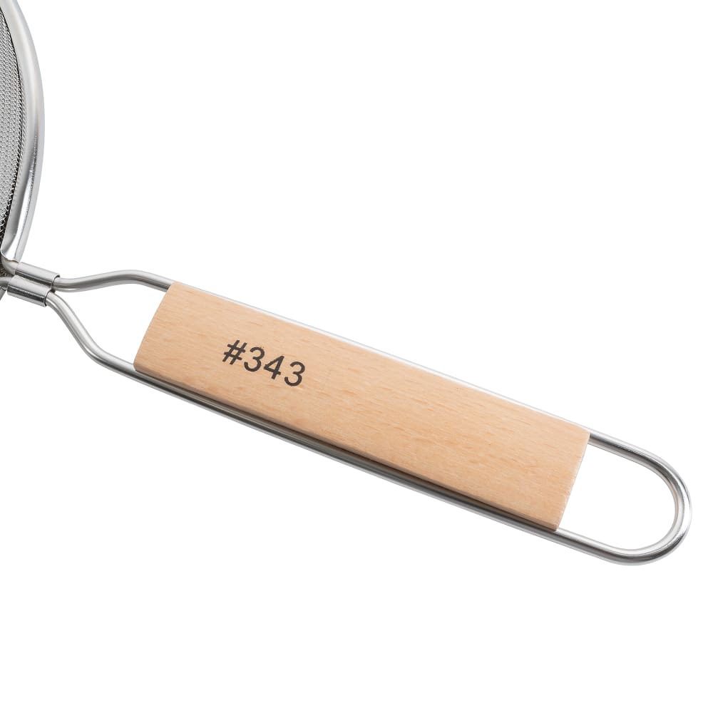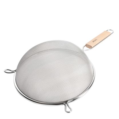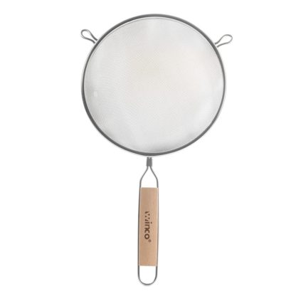 Strainer, 8″ bowl dia., 6-1/2″L handle, 14″ O.A.L., round, single fine mesh, flat wooden handle, stainless steel