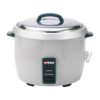 The Winco RC-P300 rice cooker can accommodate 30 rice cups of uncooked rice-unlike regular cups, industry-standard rice cups hold 6 ounces. Employees can measure ingredients with the included measuring cup or pour rice straight into the inner pot, which has measurement marks on the interior. This pot can then be dropped into the cooker so rice can soak in the water. After 30 minutes of soaking, employees can pull the lever down, and the cooking cycle will begin. For serving, this unit comes with a plastic paddle that is safer for the pot than metal spatulas as it is less likely to scrape off the nonstick finish.