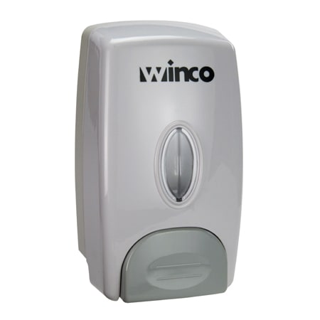 The Winco SD-100 soap dispenser can be mounted on a wall next to a bathroom or kitchen sink. To dispense soap, users push an ergonomic lever. This unit holds 1 liter, and employees can monitor when it needs to be refilled through the fill window on the front. With this soap dispenser, an establishment can increase cleanliness and reduce the spread of germs.