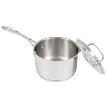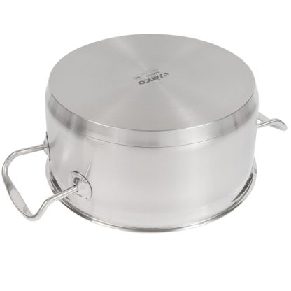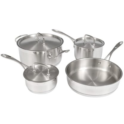 The Winco SPC-7H 7-piece cookware set equips kitchens with several essential dishes: a 1-quart saucepan, a 2-quart saucepan, a 5-quart Dutch oven, and a 91/2-inch saute pan. The saucepans and the Dutch oven come with covers, and because the dishes are made of 18/8 stainless steel, they have a sturdy, extra-heavyweight construction. An aluminum core makes the cookware heat up quickly and evenly.