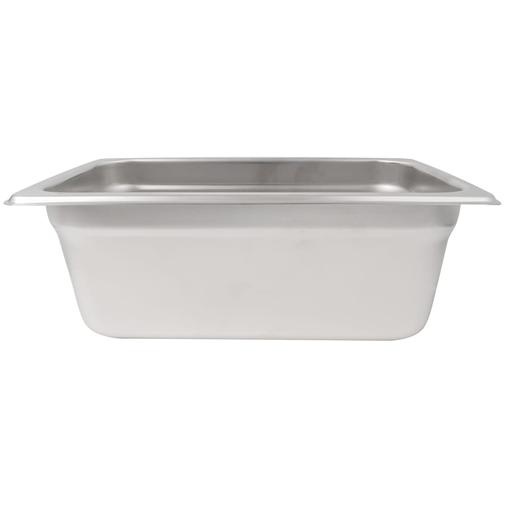 Because it is 4 inches deep, the Winco SPJL-404 fourth-size steam pan is suitable for holding side dishes and salad toppings. The pan’s standard-weight stainless steel construction provides durability and resistance to corrosion. To facilitate storage, a beveled edge inside the pan prevents it from sticking to other pans when stacked.