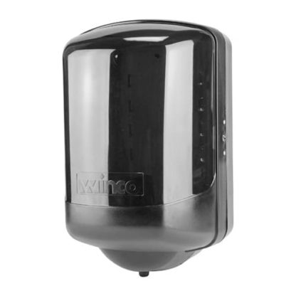 Paper towels are released from the center of the Winco TD-330 paper towel dispenser when users pull a paper towel from the bottom of the unit. Another towel is pulled through after the first for the next user to take out. This unit is made of plastic and has a diameter of 7.87 inches.