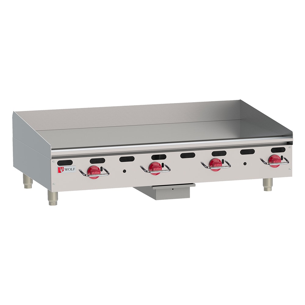 The Wolf AGM24 griddle has a 1-inch-thick plate, which retains heat better than thin plates and distributes it more evenly. Because the plate is thick, it will take longer to heat up than thin plates, but it also has more durability. The 4-inch back and side splashes, sturdy welded frame, and stainless steel construction ensure the unit is clean and stable.