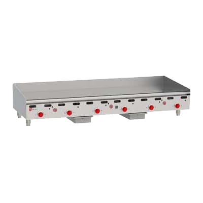 Heavy Duty Griddle, countertop, gas, 72″ W x 30″ D cooking surface, 1″ thick polished steel griddle plate, (6) burners, 4″ back & tapered side splashes, (1) mechanical snap action thermostat per burner with temperature adjustment, pilot safety, manual ignition, (2) 6 quarts grease drawer, stainless & aluminized steel chassis frame, 11-1/8″ low profile cooking height on 4″ adjustable legs, 162,000 BTU, CSA, NSF