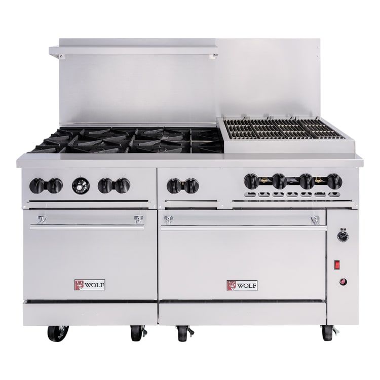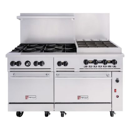 Challenger XL Restaurant Range, 60″, (6) 30,000 BTU open burners with lift-off burner heads, 24″ charbroiler with (4) 16,000 BTU burners, (2) standard oven bases, stainless steel front, sides, back riser & high shelf, fully MIG welded frame, 6″ adjustable legs, 302,000 BTU, CSA, NSF