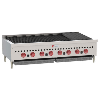 Charbroiler, 46-3/4″ W, Liquid Propane or Natural Gas, countertop, (8) 14,500 BTU burners with standing pilots and cast iron radiants, manual gas valve controls, stainless steel front, sides, top trim, backsplash & grease trough, cast iron top grates, 4″ adjustable legs, 116,000 BTU, CSA, NSF