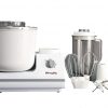 The deluxe package includes the mixing bowl with drive shaft, splash ring and lid, Tru-Mix dough hook, French whips, Turbo blender and the cookie whips.