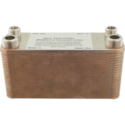 Equipped with a 1/2 inch MPT wort inlet and outlet to match up to the most common size of home brewery hoses, as well as a 3/4 inch MPT water inlet and outlet for easy connection to garden hose fittings. It measures approximately 8.25 inches long, 4 inches high and 3 inches wide.