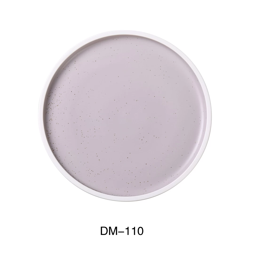 These porcelain pieces reverse traditional conventions with their patterned wells highlighted by bold undecorated rims. The speckled light purple design creates a great backdrop for the food, while maintaining a clean modern look