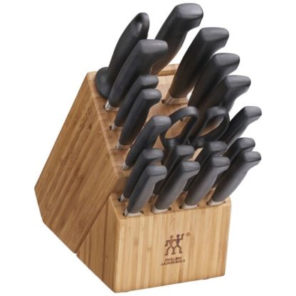 Four Star 20 Piece Block Set is the top-selling knife series of manufacturers worldwide. Honed and hand-finished by the most skilled artisans, this celebrated collection is the model of safety, ergonomics, and comfort. Thanks to their seamless transition from bolster to handle, the knives are comfortable to use for long periods of time. The bolster provides the right balance while acting as a safe finger guard. The knives are made of proprietary special formula steel that has been perfected for over 280 years. Combined with the signature ice-hardening technique, these four blades are harder, sharper, they will not stain or chip and they retain their sharpness longer. Precision-forged from a single piece of steel, the Sigmaforge knives have an exceptionally sturdy, balanced and flexible blade.