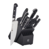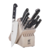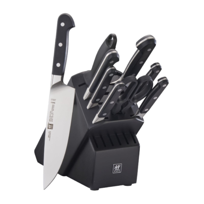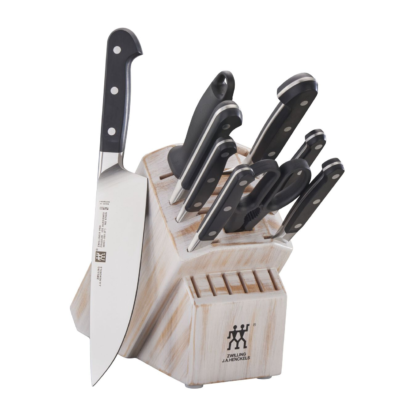 ZWILLING Pro is the most user-friendly knife available to market. The unique blade shape and ergonomic bolster are the result of 280 years of experience in knife making, and the rigorous study of how knives are used. A unique curved bolster supports the professional pinch grip, with thumb and index finger on the blade, for safe cutting and less fatigue. The Chef’s Knife blade was redesigned with a broader curve in the front to facilitate the rocking motion of Western cutting, while the straight back is ideal for the Asian chopping motion. The full length of the blade can be used when cutting and can be sharpened from bolster to tip. Designed in Italy by Matteo Thun and made in Germany by ZWILLING J.A. Henckels, the company that sets the standard for exceptional cutlery worldwide.Set includes 3″ Paring Knife, 4″ Paring Knife, 5″ Serrated Utility Knife, 5.5″ Prep Knife, 7″ Santoku Knife, 8″ Bread Knife, 8″ Chef’s Knife, TWIN Shears, TWIN Sharpening Steel, and 16 Slot Hardwood Block.